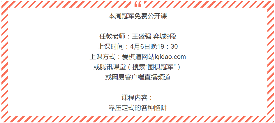 明晚19:30,王盛强老师将给大家带来最详尽的靠压定式讲解,让你近距离了解靠压定式中蕴含的各种陷阱。