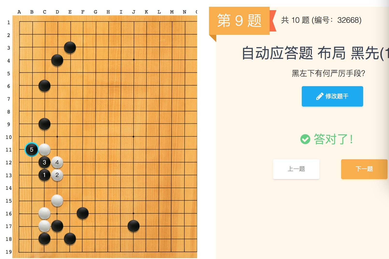 本题利用的是第四节课当中的知识点:小目高挂定式,黑棋拆一是很常见的定式变化,但是各位小朋友在线下没有学习过,所以属于完全的新定式,本定式的难点在于白棋1位托,黑2扳断后的计算,白7、9拐打后贴下来是正确下法 ,对比黑棋直接托退定式,白棋可以满意。本题的正确率,不理想,大家需要多摆多练习。